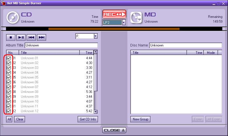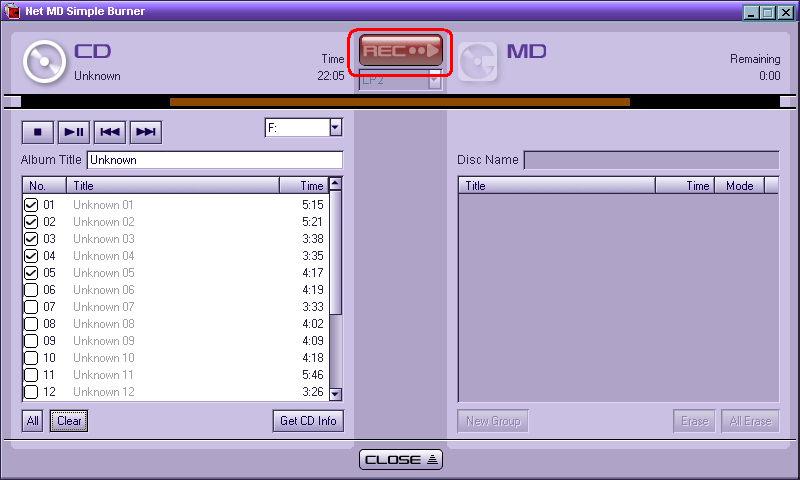 - To record the entire CD to the NetMD Walkman, click REC.