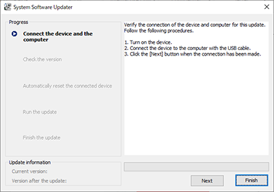 - After confirming the LCD panel for the device, click Next. The current version and the version after the update appear on the lower left part of the screen. After confirming the Current version is Ver. 1.00, click Next. If the current system software version is Ver. 2.00, the update is not required.